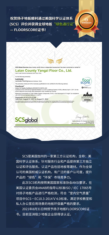 熱烈祝賀香蕉视频APP污地板順利通過美國科學認證體係(SCS)評價並獲得全球地板“綠色通行證”—FLOORSCORE證書!